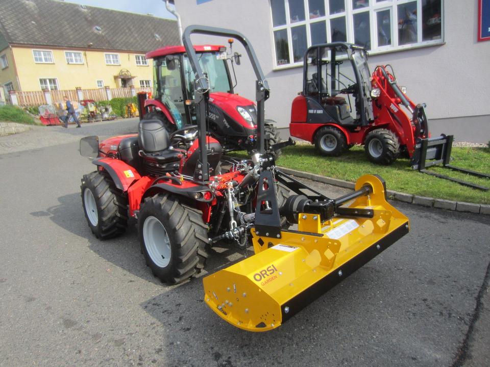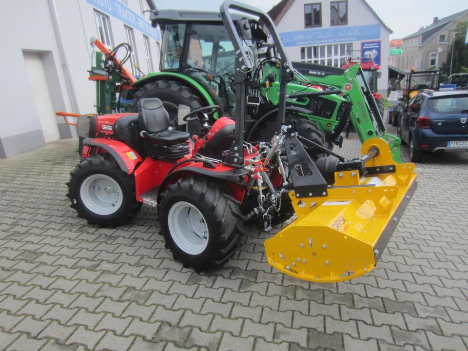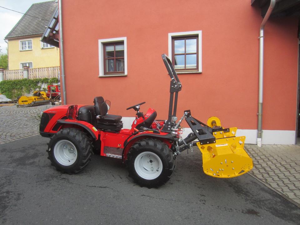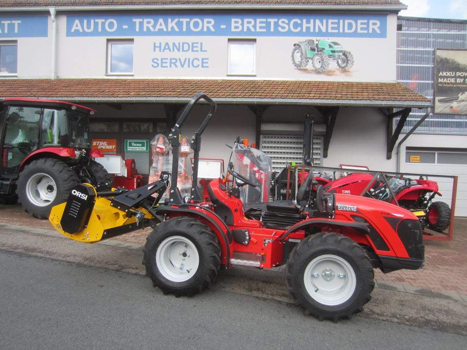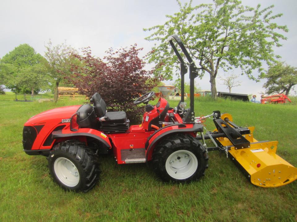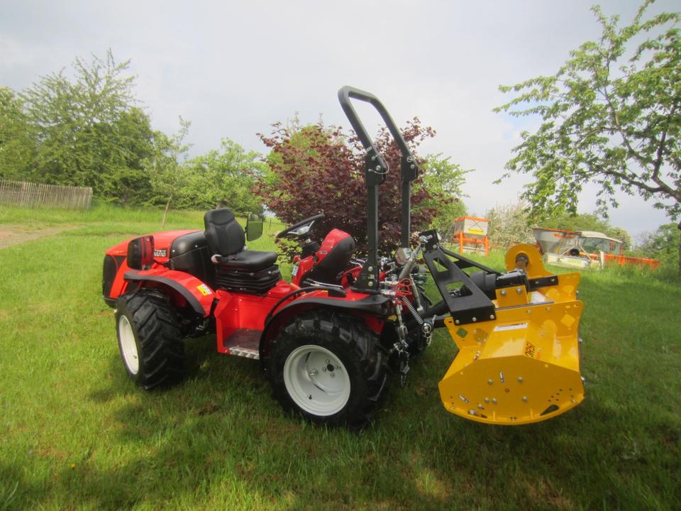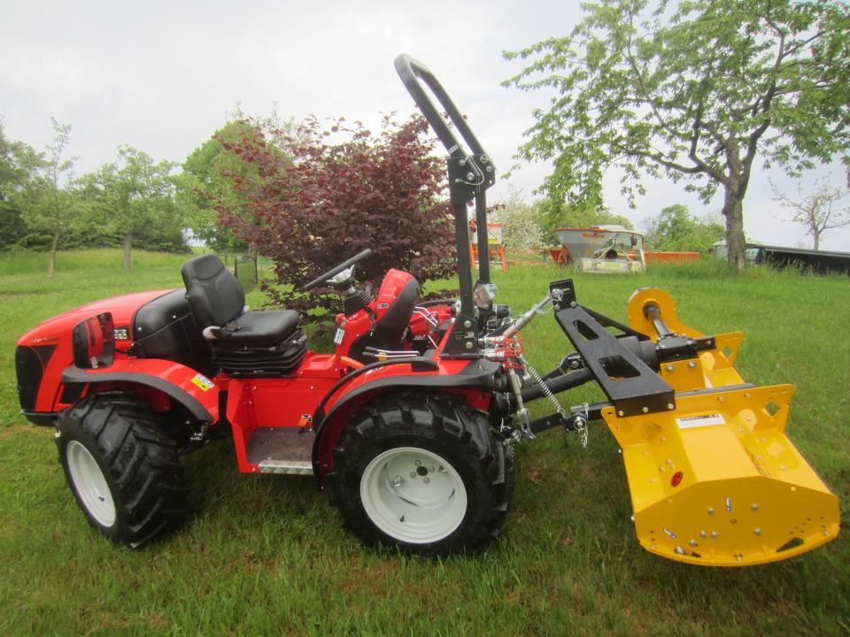 Antonio Carraro TTR 3800 Neumaschine schon mit ORSI Schlegelmulcher im Heck-Schub-Betrieb betriebsfertig montiert